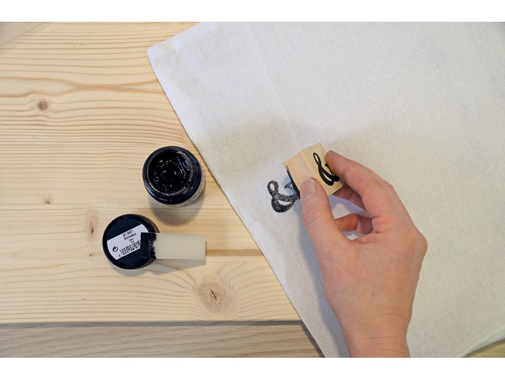 Namočte houbičku do barvy, o hranu lahvičky otřete ze houbičky přebytečnou barvu. Naneste barvu houbičkou rovnoměrně na razítko. Doporučujeme vyzkoušejte si tisk mimo látku například na novinovém papíře. Razítko stlačujte rovnoměrně na látku.