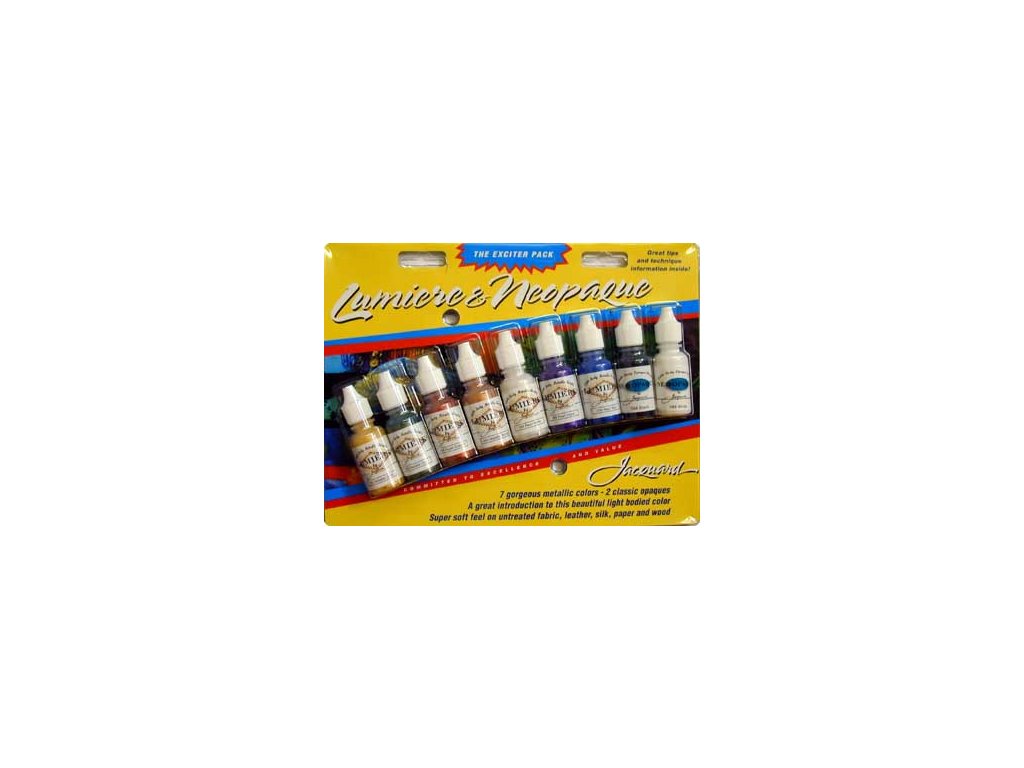 Sada barev Lumiere a Neopaque, 9 odstínů po 14ml. Barvy na textil, dřevo, kůži, polymerové hmoty, papír a podobné savé materiály, na vodní bázi. Při aplikaci na textil je nutno barvy po zaschnutí zafixovat přežehlením z rubové strany.