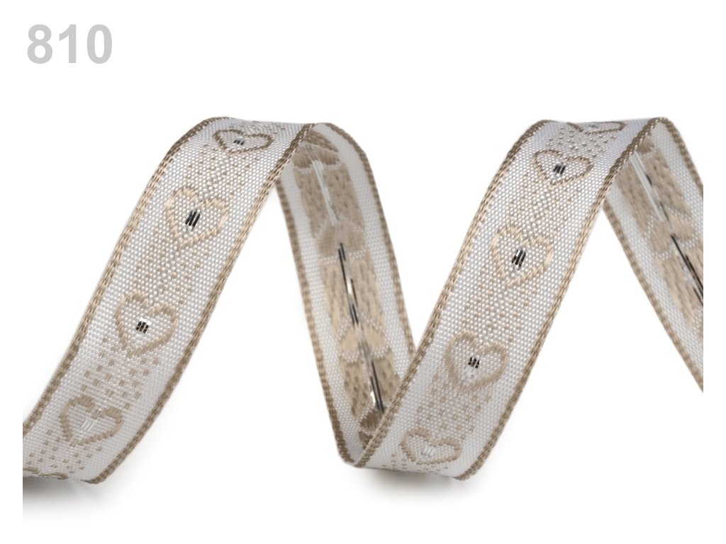 Stuha s vytkávaným vzorem srdíček je vhodná k různým dekoračním účelům. Okraje jsou zpevněny drátem a perfektně drží tvar.