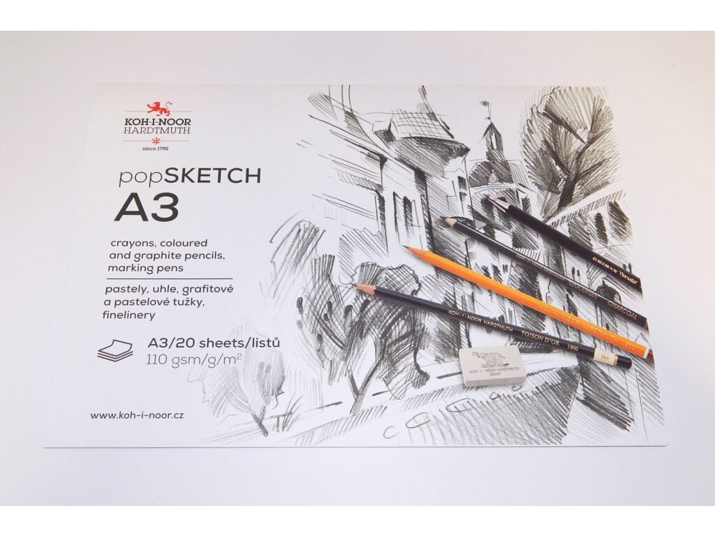 Lepený skicák pro pastelky (rovněž akvarelové), uhel, tužky, značkovače. Na přední obálce v horní části mašle, název pop Sketch, barevný motiv, text v anglickém jazyce, na levé straně obálky jazykové mutace, formát A3 – 20 listů, 110 g/m2. Zadní část obálky: karton. Lepení: po delší straně - v hlavě. Rozměr 420 x 297 x 5 mm.
