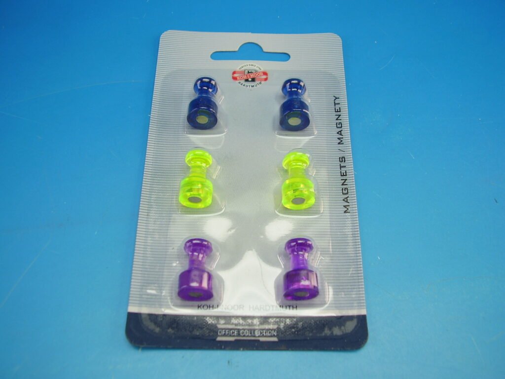 Sada 6ks magnetků ve tvaru kulatého razítka, na jehož spodní plošce je magnet. Průměr magnetu je 8 mm, výška 18 mm. Magnet je z transparentní umělé hmoty v 6 odstínech – žlutá, červená, zelená, modrá, tm. modrá, fialová, dovnitř je vlisován magnet. Magnety se používají např. na uchycení papíru na magnetickou tabuli. 6 ks magnetek je uloženo v blistru.