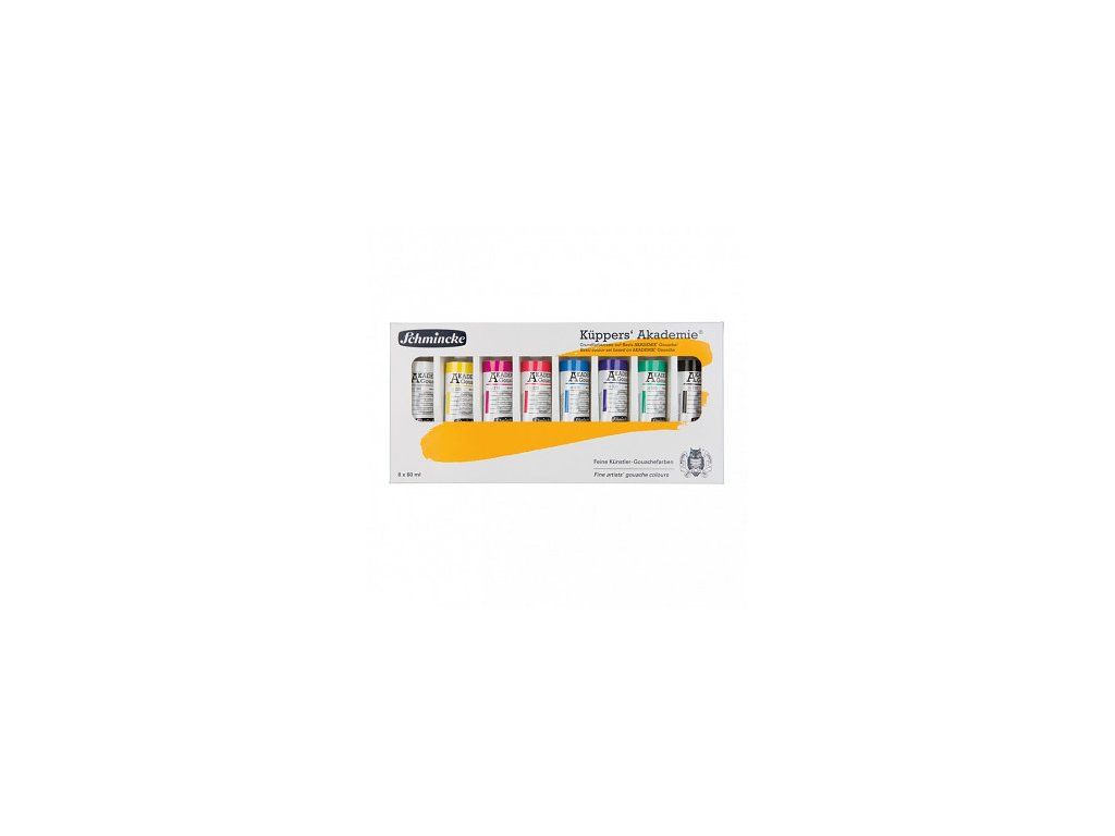 Základní sada kvašových barev AKADEMIE® vysoké kvality německého výrobce Schmincke. Sada obsahuje 8 základních odstínů barev v tubách po 60 ml. Barvy jsou vodou ředitelné, znovusmáčitelné a mohou být lehce překryté novou vrstvou malby po zaschnutí. Barvy se vyznačují velice vysokou světlostálostí, zvýšenou intenzitou a hloubkou barev.