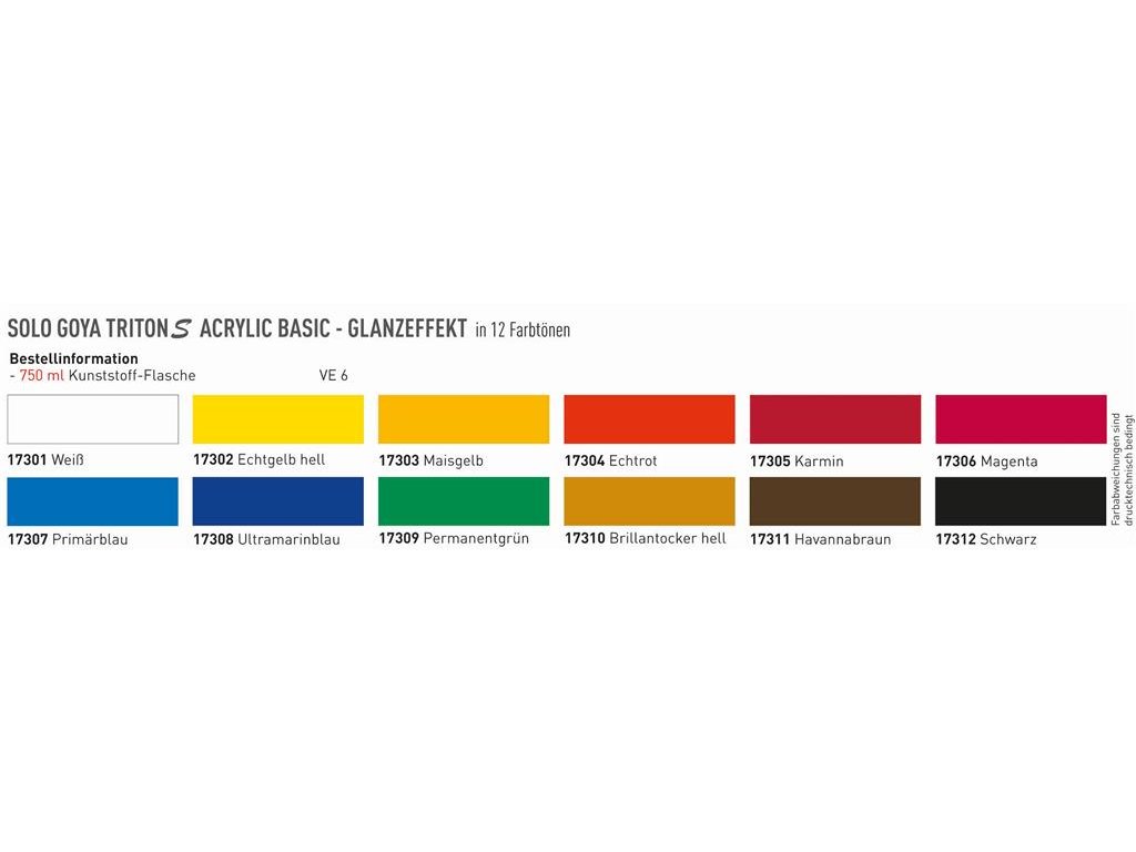 Lesklé akrylové barvy Solo Goya TRITON Acrylic v 18 odstínech mají tytéž vlastnosti jako Solo Goya TRITON Acrylic, mají ale lesklý efekt. Balení 750ml. Ideální barvy pro umělecké akademie, školy a workshopy. Nejen díky velkému balení jsou vhodné pro všechny techniky, u kterých je třeba velké množství kvalitní barvy, například při ztvárňování velkých ploch. Jsou univerzálně použitelné na širokou škálu povrchů - na papír, dřevo, plátno, lepenku, kámen, kovy, kůži, a na mnoho syntetických materiálů.