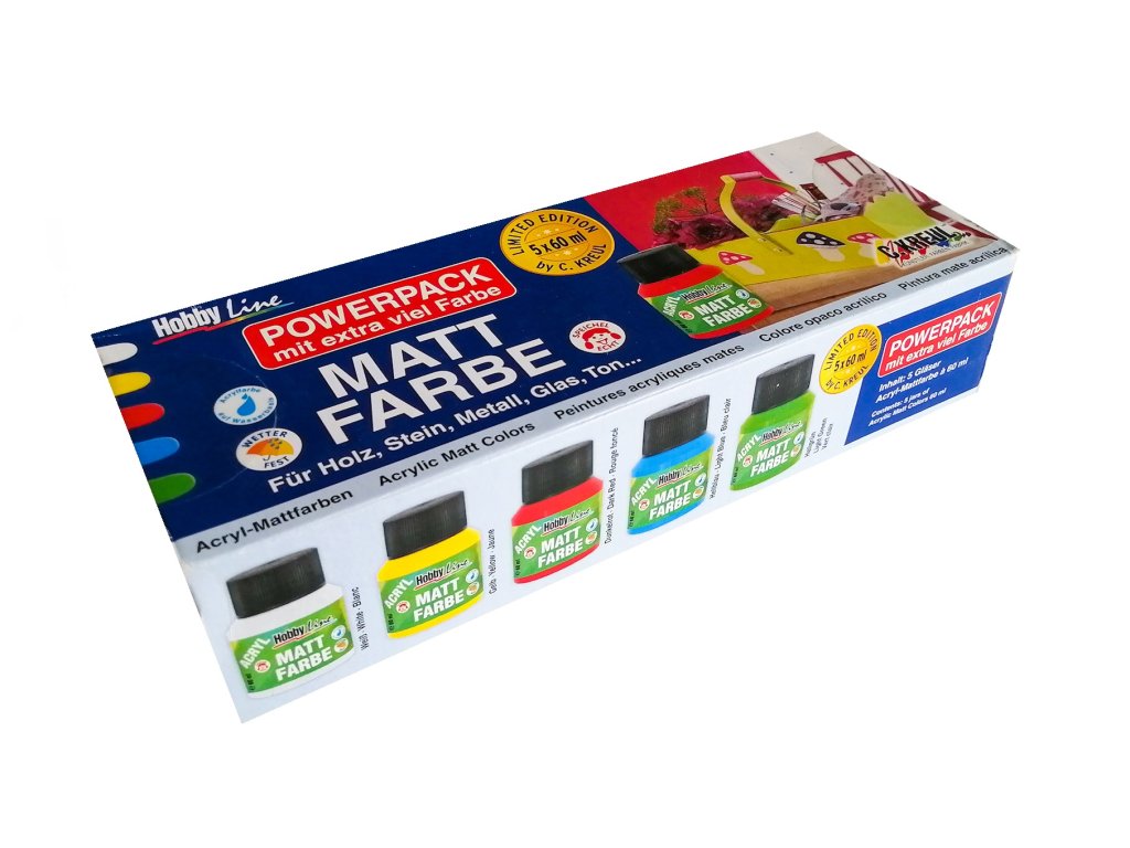 Sada akrylových matných barev Hobby Line (5 ks). Limitovaná edice setů s extra barvou navíc - 60 ml nádobky! Obsah sady: 5 odstínů po 60 ml - bílá, žlutá, tmavě červená, světle modrá, světle zelená).