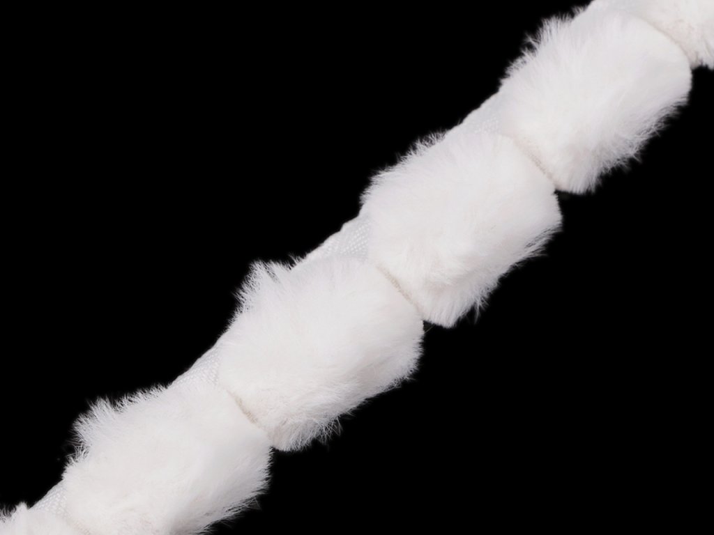 Všívací lemovka s kožešinovými bambulkami vás okouzlí svým jedinečným vzhledem a hebkostí. Na boku má textilní pruh široký 1,3 cm, který slouží do všití lemů či švů. Bambulka je velká přibližně 2 x 3 cm.