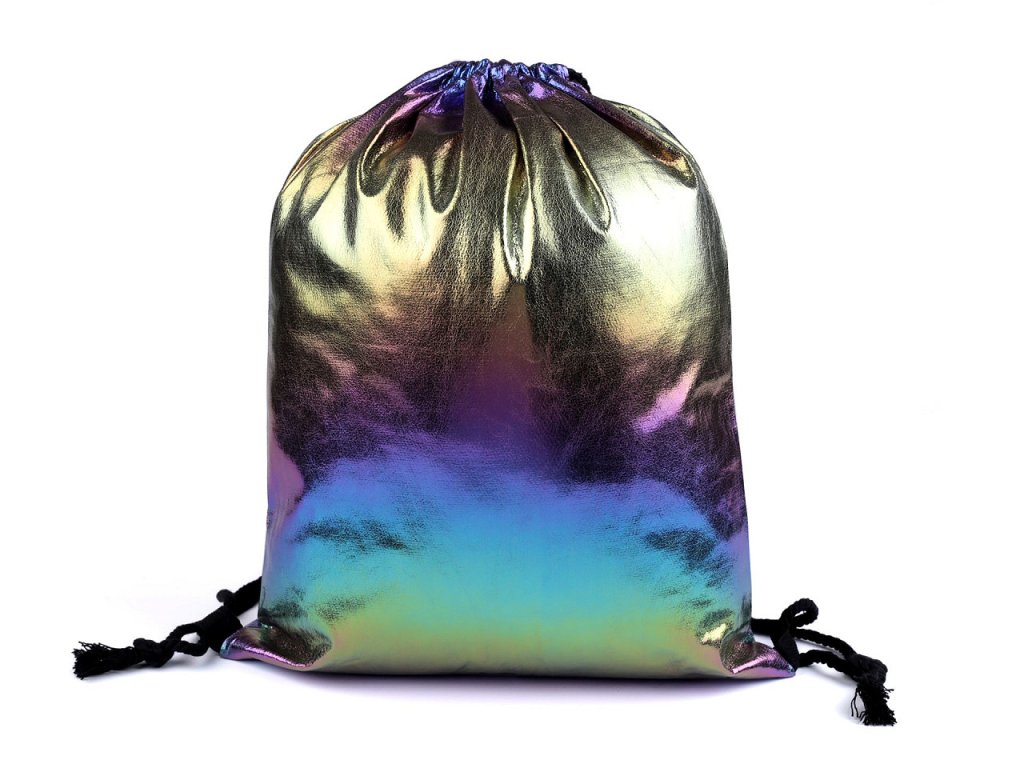 Duhový metalický vak na záda se stahuje jednoduše pomocí bavlněných šňůrek. Můžete do něj schovat boty, přezůvky i oblečení. Ocení ho nejen mládež, ale i dospělí.