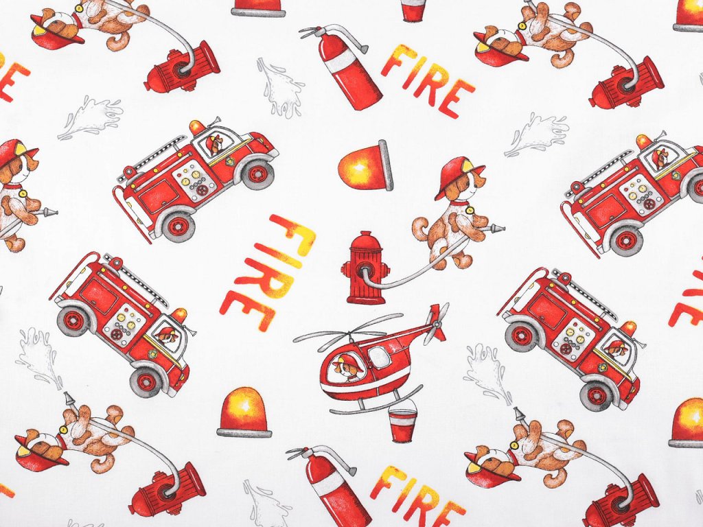 Bavlněnou látku zdobí potisk s pejsky - hasiči. Děti si ji zamilují na povlečení, pytlících, mantinelech do postýlek, kapsářích, taškách apod.