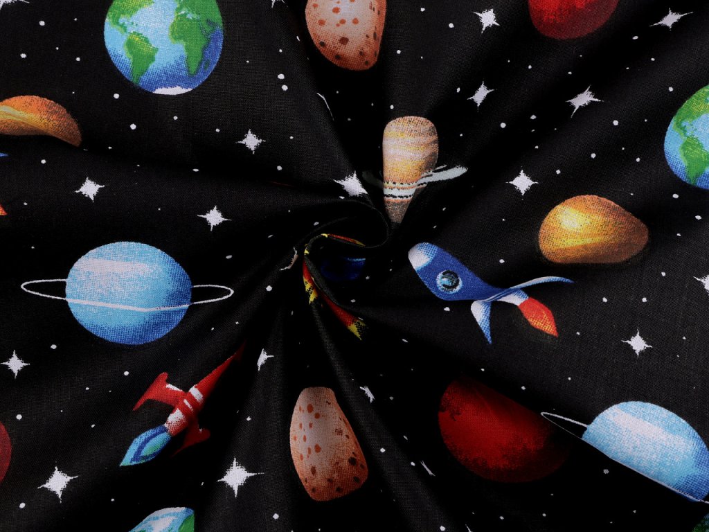 Bavlněnou látku s designem vesmíru využijete na šití polštářů, povlečení, závěsů, pytlíků, tašek, mantinelů do postýlek i hnízd pro děti.