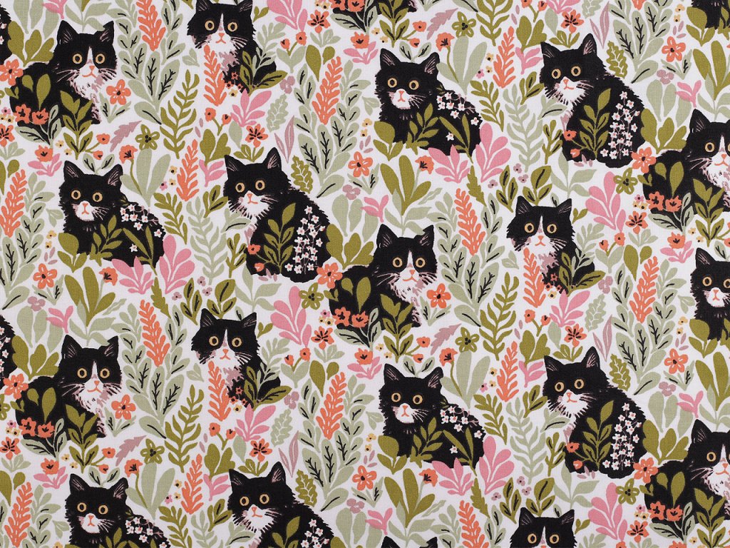 Bavlněná látka s motivem koček vnese do každého projektu hravost. Využijete ji na šití polštářů, povlečení, závěsů, pytlíků, tašek, mantinelů do postýlek a dalších dekorací a doplňků.