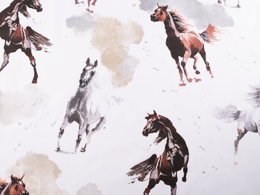 Bavlněná látka s motivem koní je vhodná na šití polštářů, povlečení, závěsů, mantinelů do postýlek, hnízd pro děti i oblíbených dětských teepee.