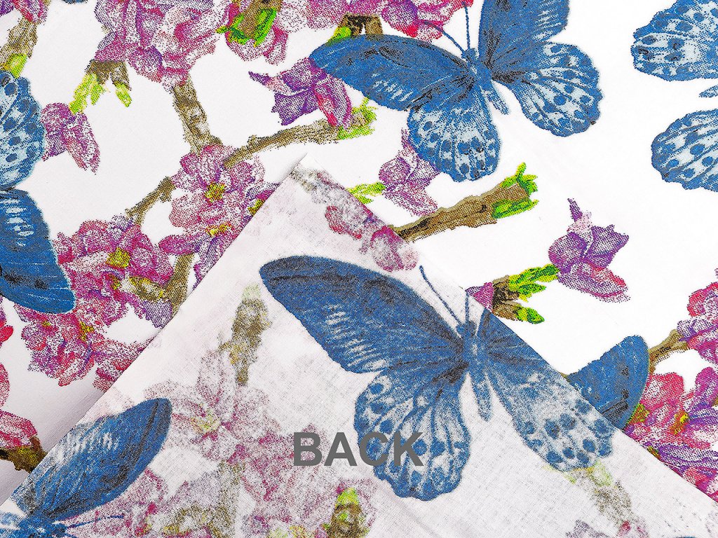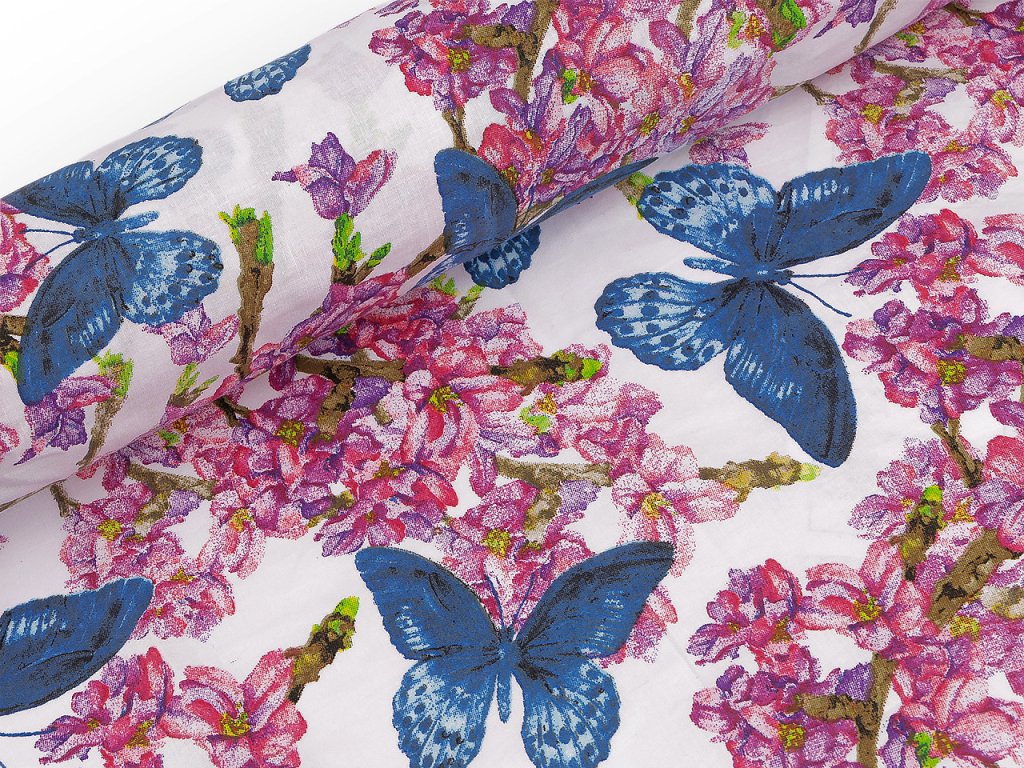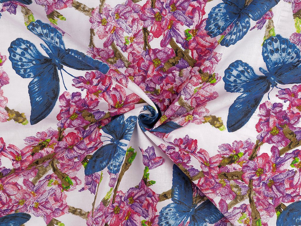 Bavlněná látka s motivem květů a motýlů vnese do interiéru svěží atmosféru. Využijete ji na šití povlečení, polštářů, závěsů, ubrusů, prostírání, tašek, pytlíků a různých bytových dekorací a doplňků.