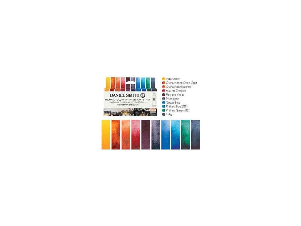 - 10 vybraných odstínů (Indian Yellow, Quinacridone Deep Gold, Quinacridone Sienna, Alizarin Crimson, Perylene Violet, Moonglow, Cobalt Blue, Phthalo Blue, Phthalo Green, Indigo)