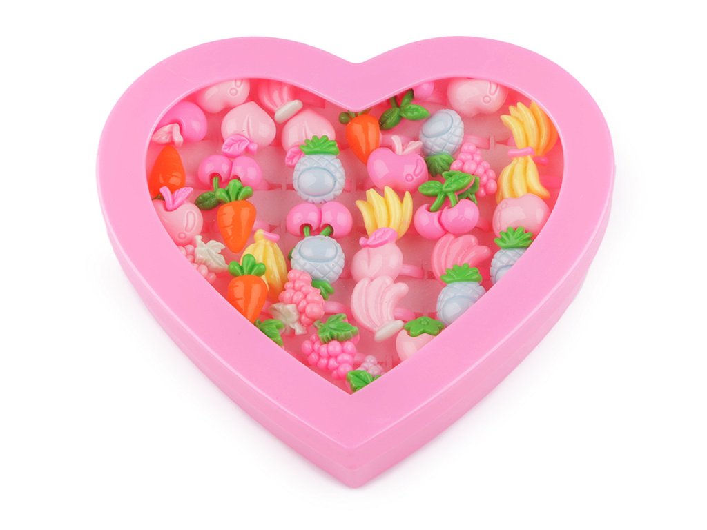 Mix dětských prstýnků je zabalený v plastové srdcové kazetě, která má průhledné plastové víko. Je ideální na prodejní prezentaci. Prsteny jsou ozdobené barevnými 3D ozdobami s různými motivy, u dětí jsou velice oblíbené.