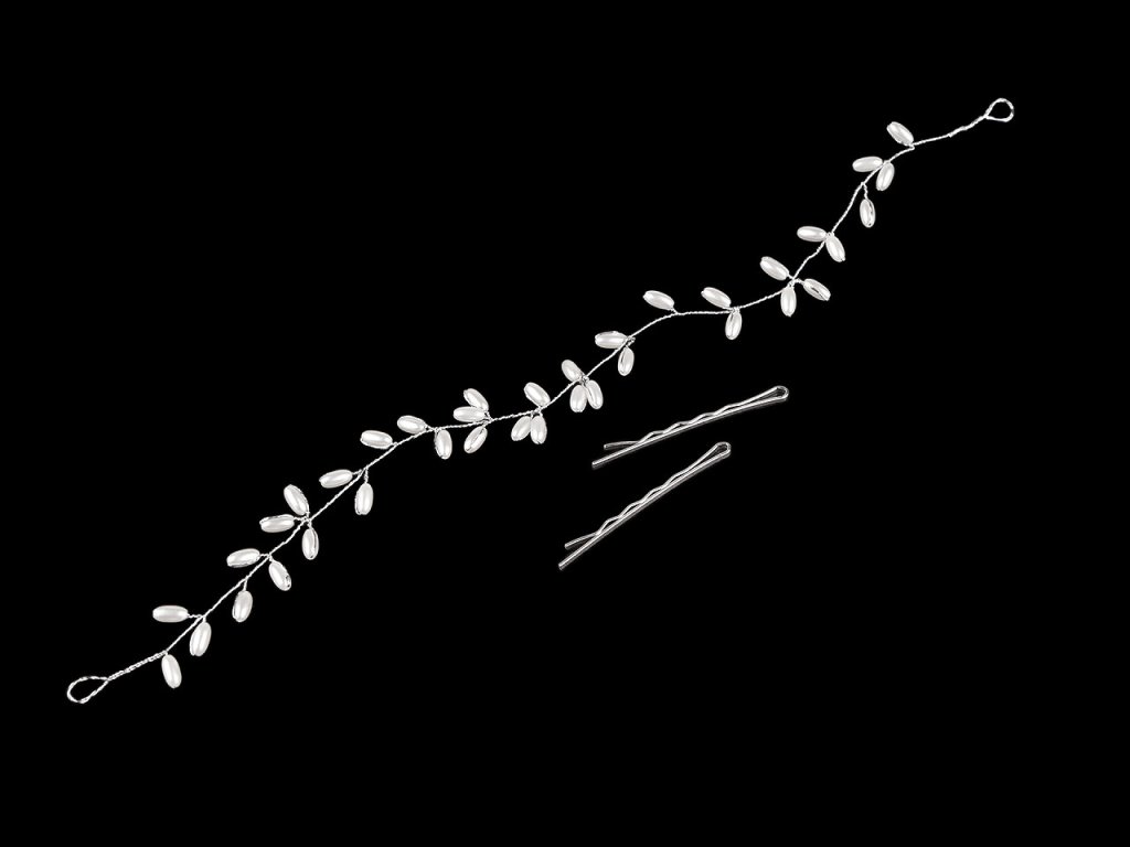 Romantická ozdoba s perlovými korálky bude jemným a elegantním doplňkem vašich vlasů. Je tvořená z dvou do sebe zapletených drátků, do kterých jsou vkomponované podlouhlé voskové korálky připomínající perly. Díky drátkům je ozdoba lehce ohybatelná a lze ji prostorově tvarovat. Čelenku využijete jako nevšední doplněk na svatby, svaté přijímání či na plesy.