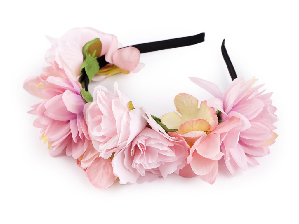 Květy jsou pevně přichycené ke kovové čelence, která je potažená saténovou stužkou.
