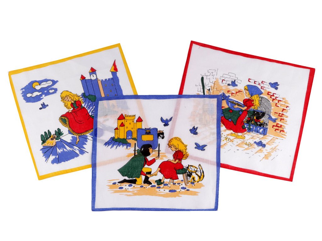 Tradiční látkové dětské kapesníky jsou ozdobené pohádkovými motivy. Díky příjemnému materiálu jsou kapesníky jemné k dětské pokožce, jejich kvalitní zpracování zaručuje vysokou odolnost a dlouhou životnost. Dětské obrázkové kapesníky jsou ideální pro použití ve školce, školách, na výletech i při rodinných akcích.