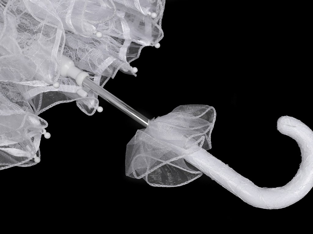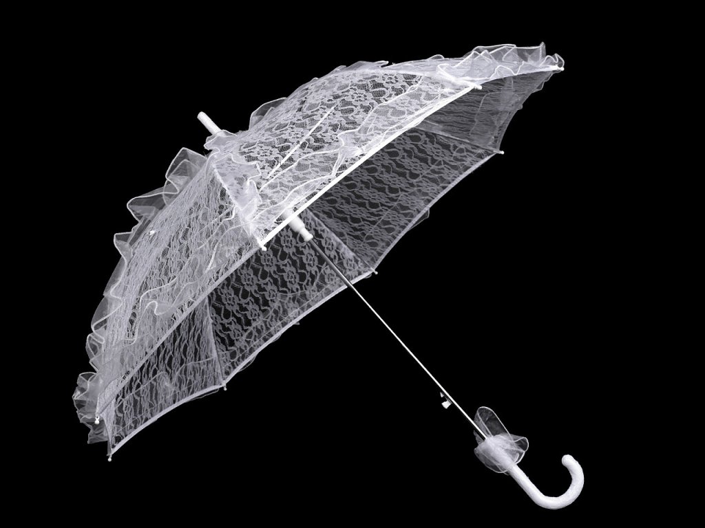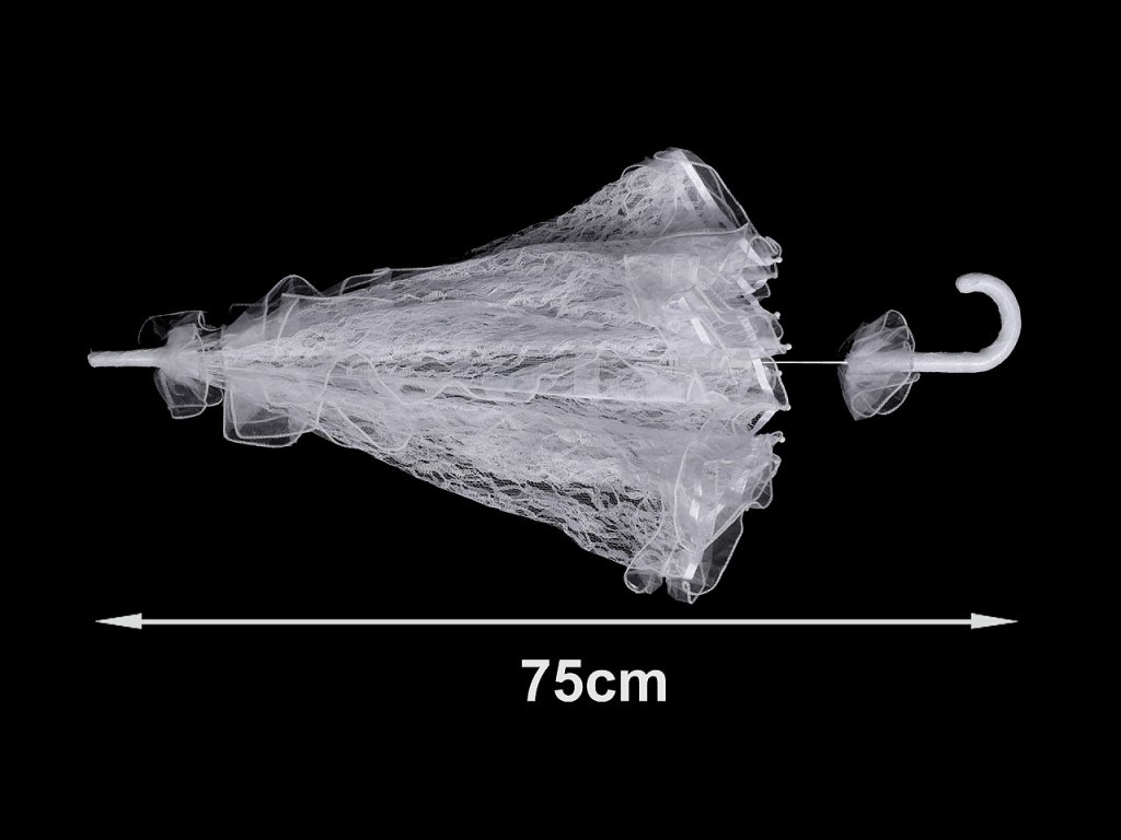 Deštník je vystřelovací, celokrajkový, okraje i jednotlivá pole má ozdobené nařaseným volánkem. Má klasickou tyč zakončenou pevnou rukojetí, která je obalená krajkou. Kovová konstrukce deštníku se skládá z 8 polí, zajišťuje vysokou pevnost a stabilitu.