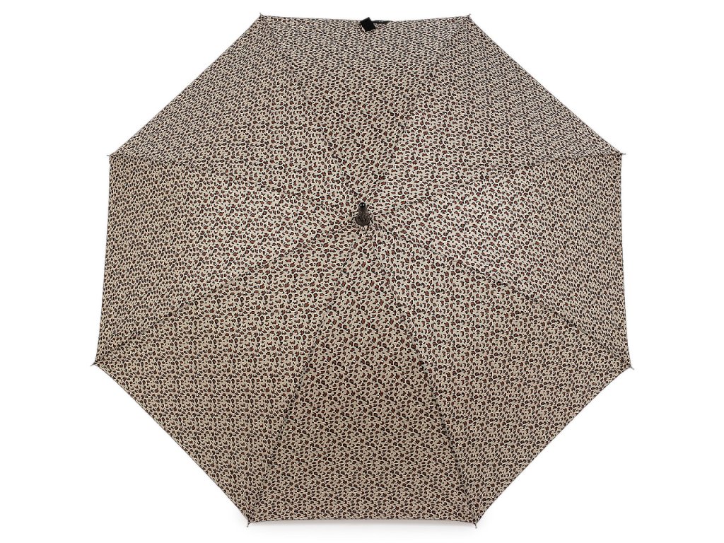 Velký dámský deštník se zvířecím vzorem je stylovým a praktickým doplňkem pro každou ženu. Díky svému atraktivnímu designu, dodá šarm i těm nejzamračenějším dnům. Je vystřelovací, konstrukci má z kovového drátu a pružných lamel, které tvoří osm polí. Díky nim je velice pevný, neohne se ani za největšího nečasu. UV filtr vás ochrání před slunečním zářením. Klasická tyč je zakončená pevnou rukojetí.