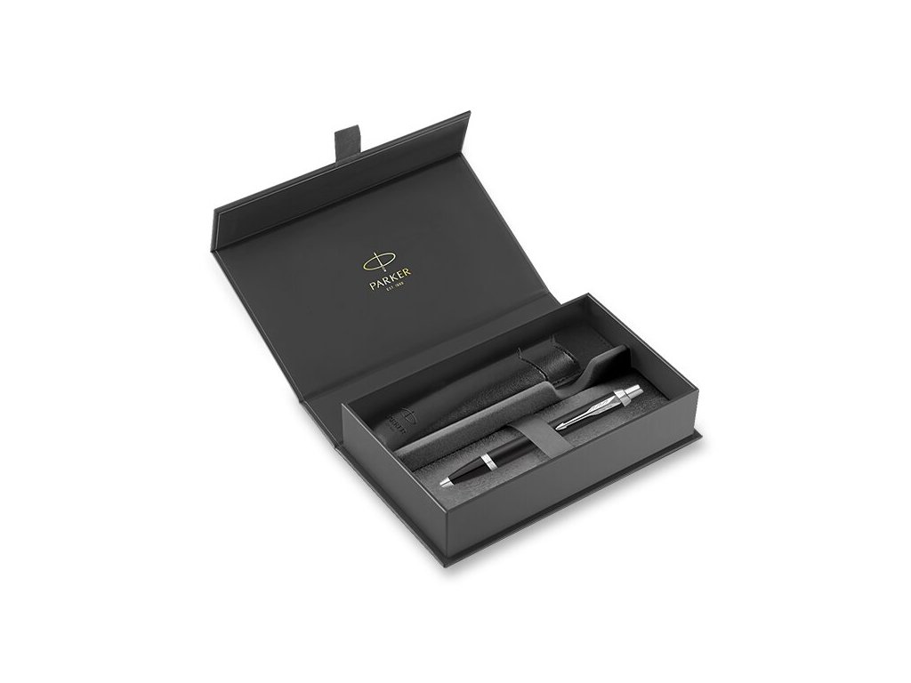 Sada obsahuje černé PU pouzdro a kuličkové pero Parker IM Essential Black s mosazným tělem s matně černě lakovanou povrchovou úpravou. V kombinaci s doplňky pokovenými chromem.