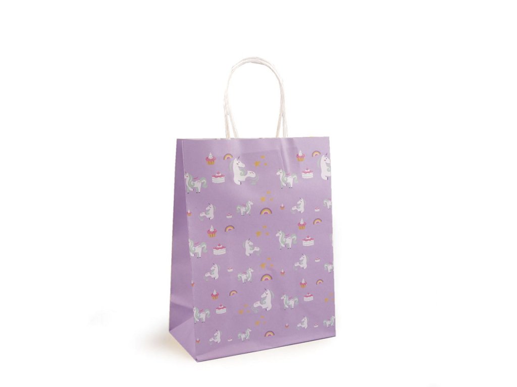 Papírová dárková taška je z obou stran ozdobená dětskými motivy. Ucha tašky jsou z krouceného papírového provázku. Taška je vhodná k darování dárků i k balení zboží v prodejnách.