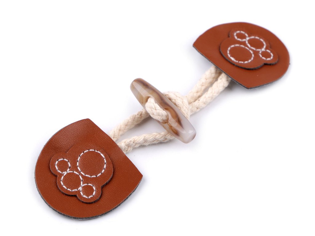 Designové zapínání z eko kůže s olivou zdobí prošití v podobě tlapek. Využijete ho na kabáty, vesty, svetry, mikiny apod. Je vhodné také pro šití duffle coat.