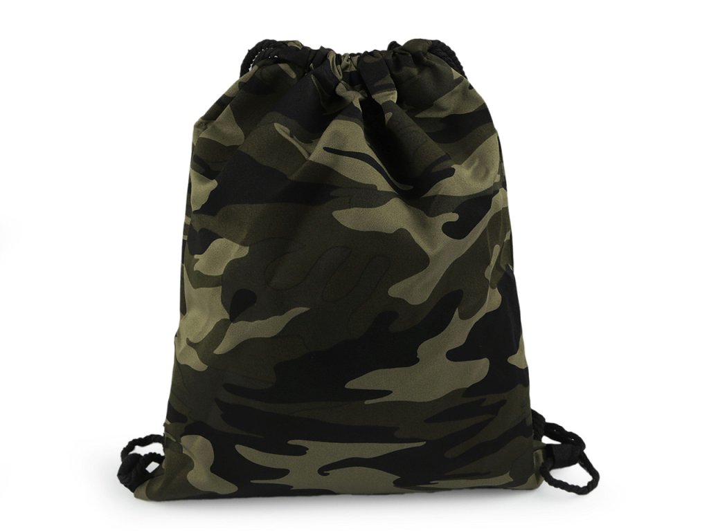 Vak na záda v maskáčovém designu zaujme hlavně ty, kteří milují army styl. Stahuje se jednoduše pomocí bavlněných kroucených šňůrek. Do vaku můžete schovat boty, přezůvky i oblečení. Využijí ho sportovci, rybáři, trempové i děti do školy.