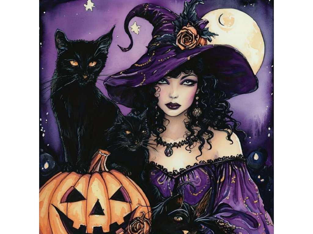 Diamantový obrázek - čarodějnice s kočkou 30 x 40 cm