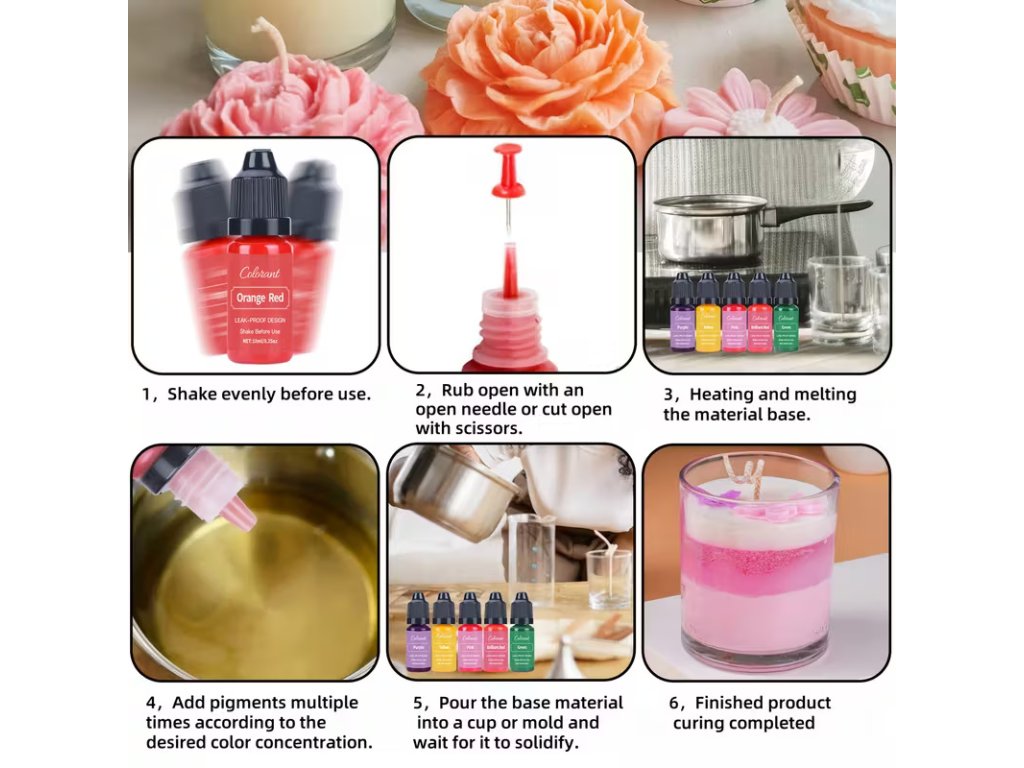 Tato rozsáhlá sada obsahuje vysoce koncentrované olejové pigmenty ve 20 pestrých odstínech, které dodají vašim výrobkům profesionální vzhled. Barvy jsou navrženy tak, aby se snadno mísily a rovnoměrně rozpouštěly, díky čemuž jsou ideální pro kreativní výrobu svíček z různých druhů vosků, dekorativních mýdel nebo projektů z pryskyřice.