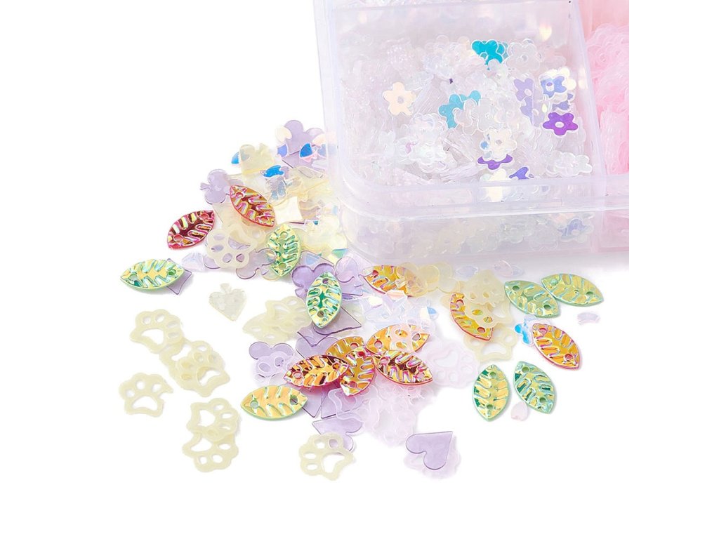 Plastové flitry v 12 tvarech (tlapička, květina, jahoda, srdce, lísteček, symboly hracích karet aj.) v mixu jemných pastelových a lesklých barev dodají projektu hravý a výrazný efekt. Jsou vhodné na přišívání, lepení na papír, textil, pěnovku nebo jako výplň do shaker tagů a pryskyřičných odlitků.