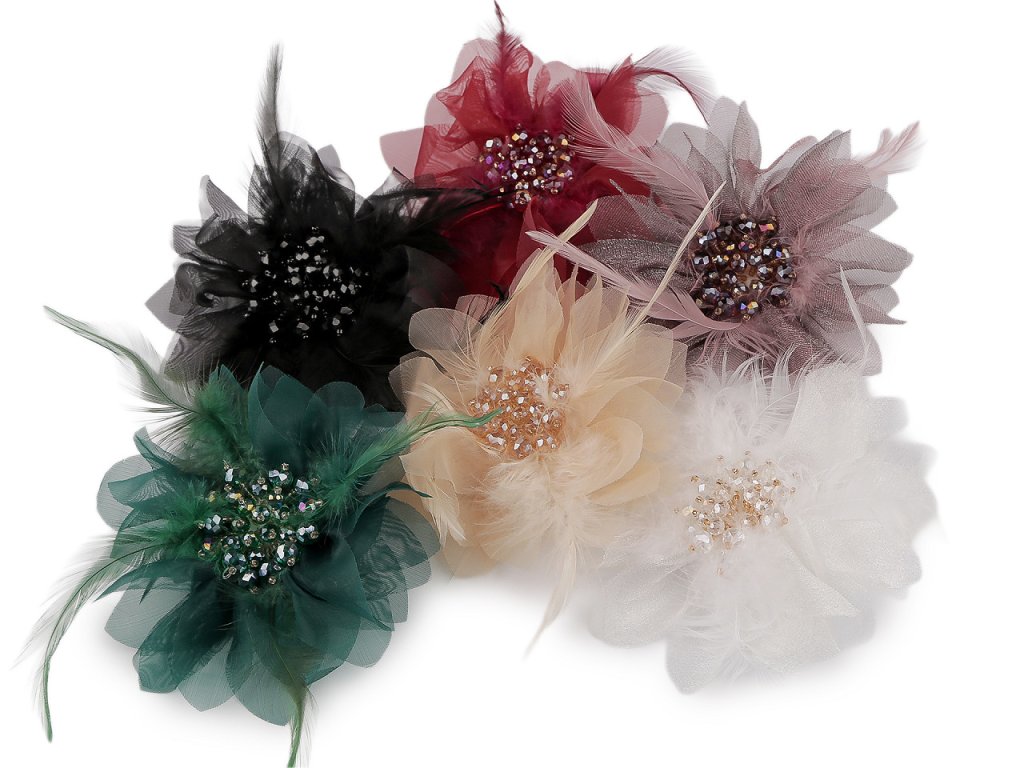 Velká elegantní brož je vyrobená z jemného šifonu, který připomíná květinu, a její střed je zdobený peřím a třpytivými broušenými korálky, které jí dodávají luxusní vzhled.