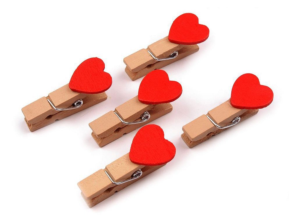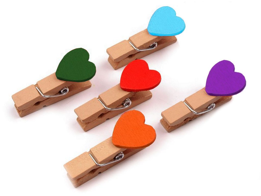 Dřevěné kolíčky se srdíčky v pestrých barvách se zalíbí především dětem a potěší i zamilované.Použití: Veselá dekorace oživí především dětské pokojíčky. Stačí jen natáhnout šňůrku a kolíčkem přichytit oblíbené fotografie vašich nejmenších. Také kresby, které vytvoří vaši malí umělci, najdou na šňůrce své místo. Dekorační kolíčky můžete použít k uchycení jmenovek při určování zasedacího pořádku u svatebního stolu.Balení obsahuje: kolíčky se srdíčkem, šňůrku o délce cca 100 cm