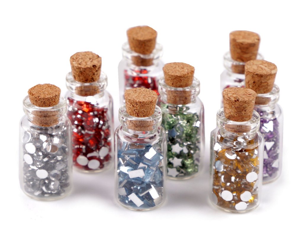 Sada 8 skleněných lahviček s mini plastovými kamínky se hodí na dozdobení mozaiky, nalepení na přáníčka apod. Kamínky dodají třpyt a originalitu všem vašim projektům. Hodí se k nalepení na materiály jako je plast, dřevo, kámen, kov, keramika a jiné. Zadní strana je hladká se stříbrným zátěrem. Skleničky se uzavírají korkem. Kamínky můžete ozdobit kartónové a dřevěné krabičky, květináče, šperkové polotovary, skleněné vázy, svícny, lahve, amfóry, kameny apod.