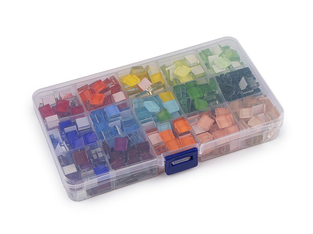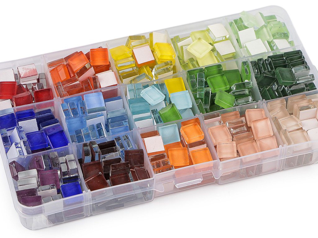 Sada skleněných mozaikových kamínků v boxu vás nadchne svou barevností. Kamínky vynikají nádherným leskem a dokonalým povrchem. Hodí se k nalepení na materiály jako je plast, dřevo, kámen, kov, keramika a jiné. Hrany nejsou ostré, zadní strana je hladká. Mozaikou můžete ozdobit kartónové a dřevěné krabičky, květináče, šperkové polotovary, skleněné vázy, svícny, lahve, amfóry, kameny apod.