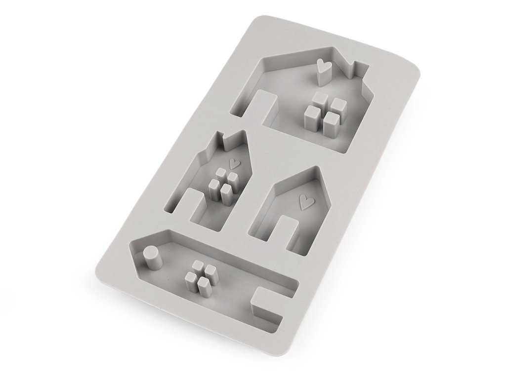Rozměry domečků jsou 4,5 x 7 cm, 4,5 x 8,5 cm, 4,1 x 12,1 cm a 9,5 x 9 cm. Hloubka formy po okraj je 1,8 cm.]