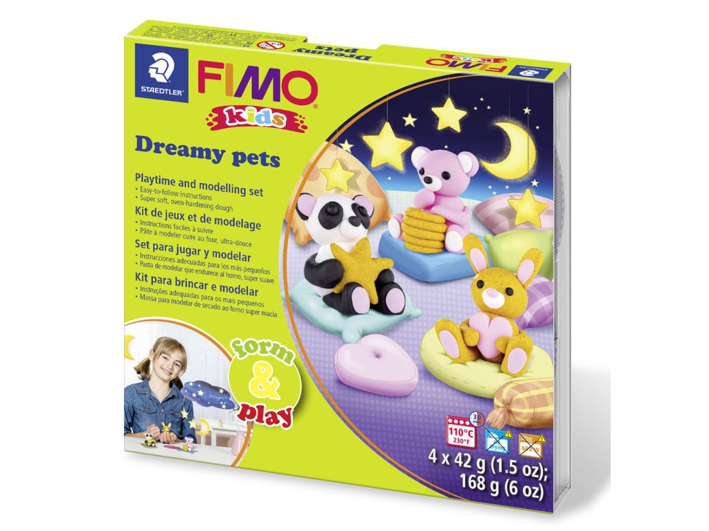 Se sadami FIMO kids "form & play" mohou děti vytvářet různé tematické světy podle detailních a dětem srozumitelných pokynů a vytvořit si tak svůj vlastní příběh ve světě her, který si vlastnoručně vyrobily. Bez ohledu na množství zkušeností s modelováním, které děti mají, každý si může vybrat svou úroveň obtížnosti (1=snadné, 2=středně obtížné, 3=obtížné) a dostane detailní, srozumitelný návod jak postupovat krok za krokem s množstvím obrázků. Obrázky odpovídají obtížnosti dané sady. Každá sada obsahuje čtyři balení FIMO Kids, pozadí, které se hodí k danému tématu a brožurku s návodem. Modelovací hmota je skladována čistě a bezpečně chráněna od špíny a prachu ve znovu uzavíratelné krabici.