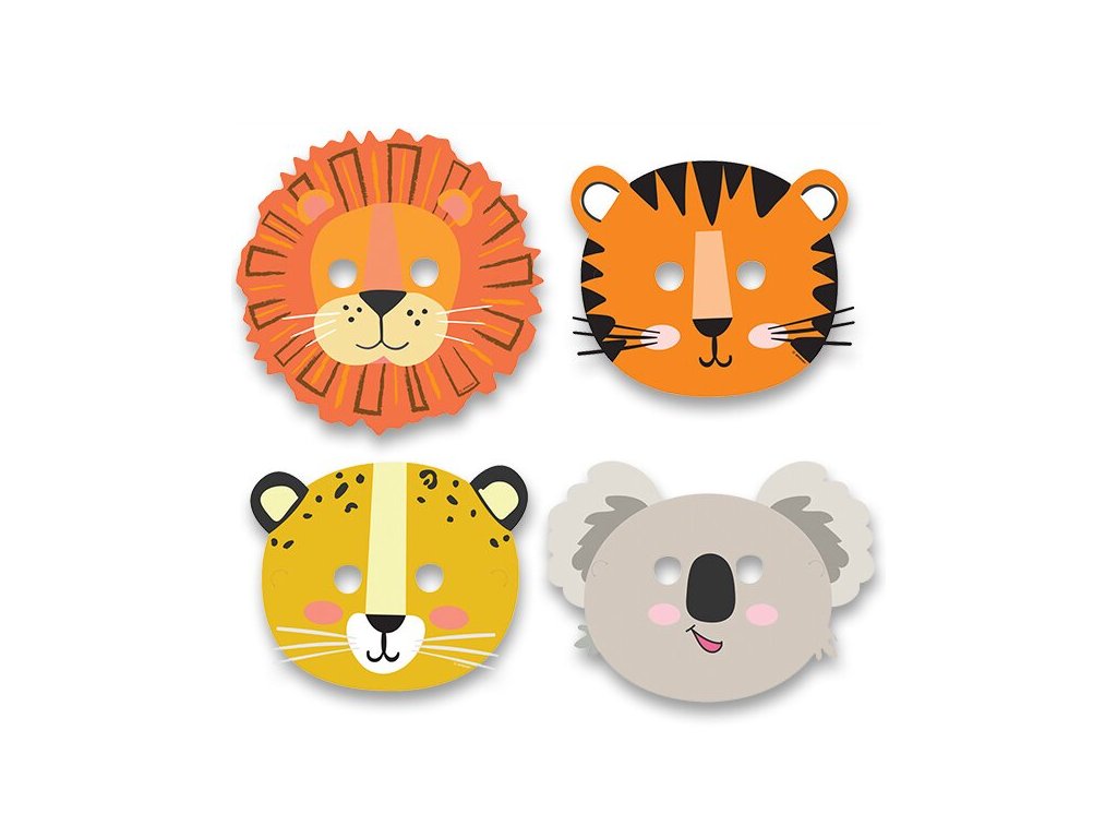 Papírové masky s tématickým potiskem 4 druhů zvířat. Balení obsahuje 8 kusů.