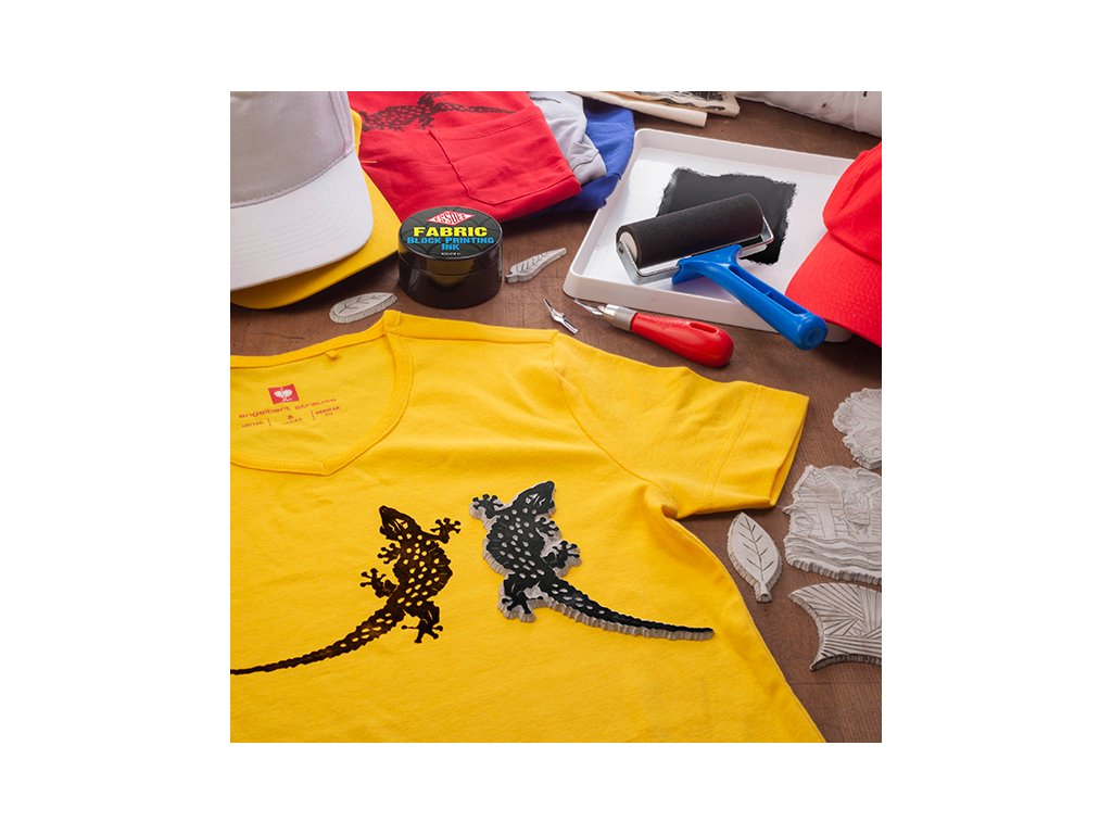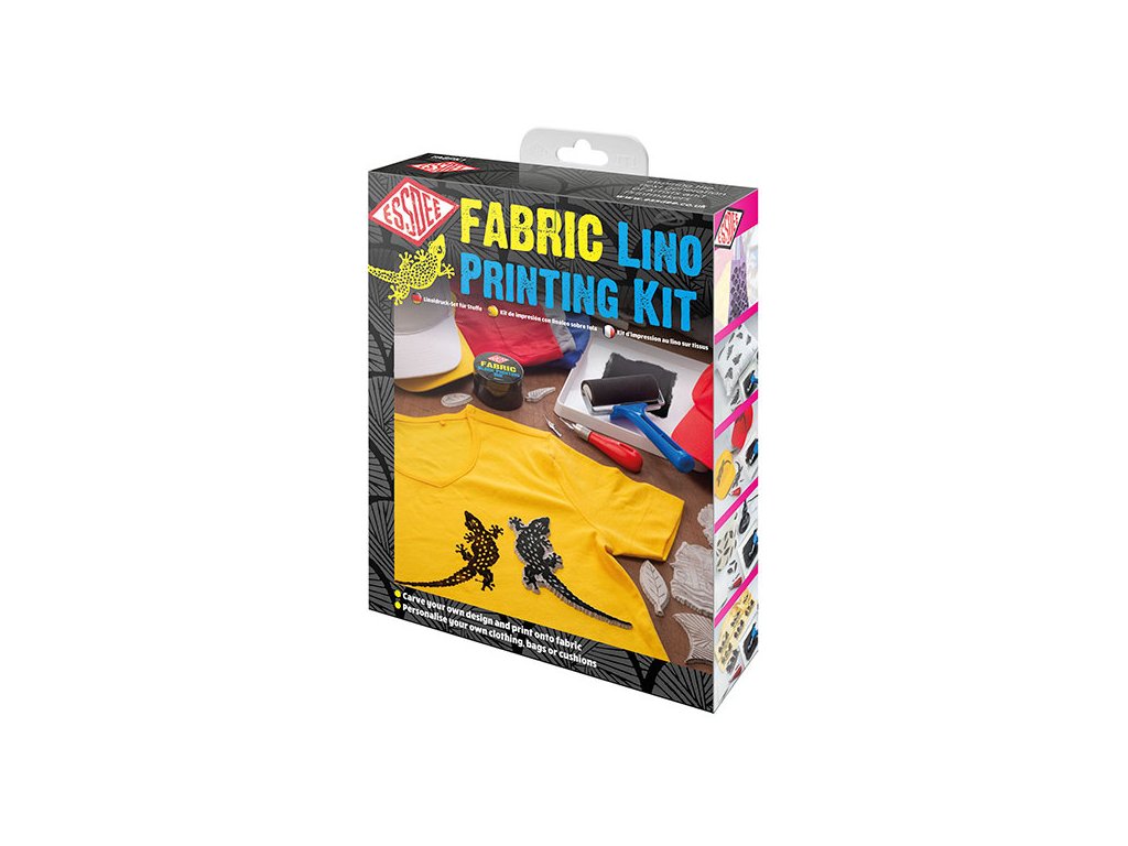 V sadě naleznete vše potřebné k tvorbě návrhů a potisků na tkaniny. Lino MasterCut, řezáky vč. úchytky, černou barvu určenou pro tisk na textil, váleček, který je speciálně navržený k tisku na látku, miska na barvu, předlohy
