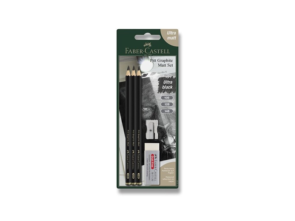 Sada 3 grafitových tužek Faber-Castell Pitt Graphite Matt o různých tvrdostech, ořezávátka a pryže.