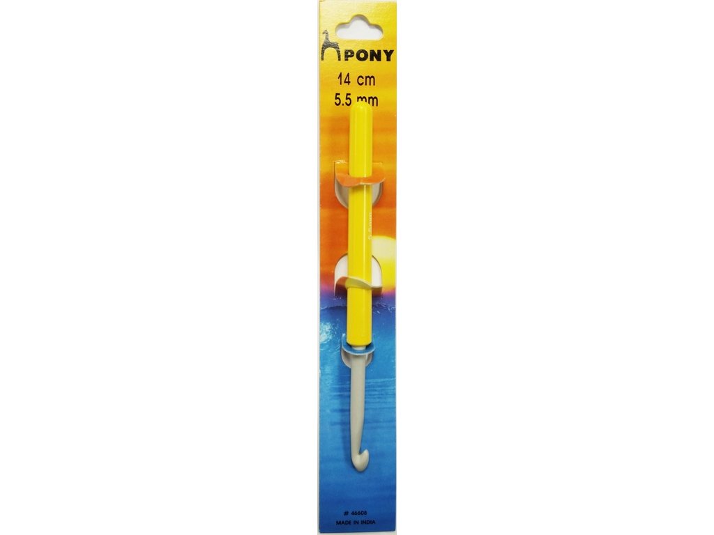 Háček s plastovou rukojetí na háčkování silnějších přízí, vyroben z hliníku se speciální povrchovou úpravou. Háček je lehký díky materiálu, ze kterého je vyroben.