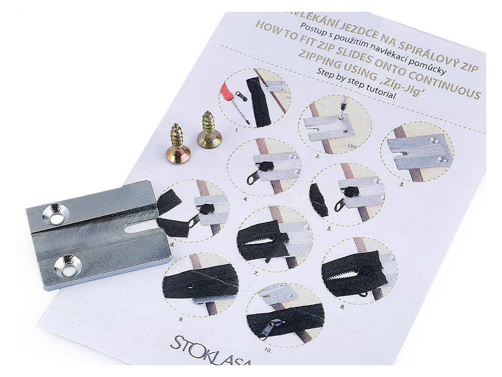 Kovová pomůcka vám usnadní práci s navlékáním zipů v metráži. Je vhodná na spirálové zipy s šíří 3 mm[, 5 mm, 8 mm a 10 mm]