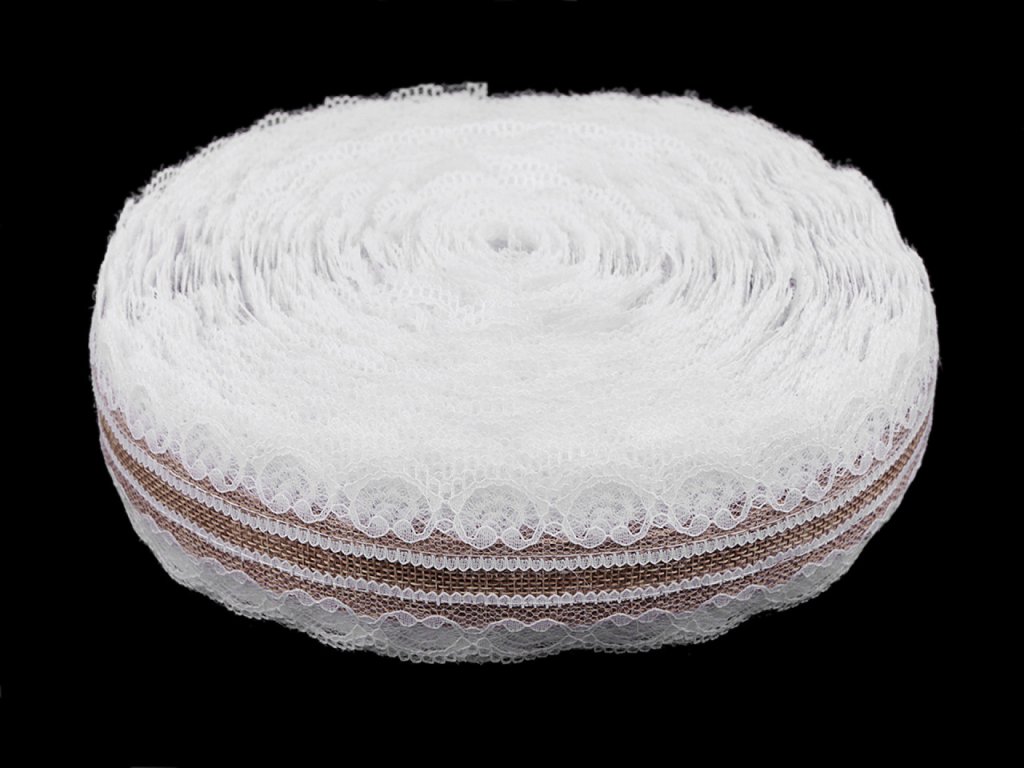 Jutová stuha je po obou stranách ozdobená jemnou krajkou s obloučky, která jí propůjčuje starobylý vintage vzhled.