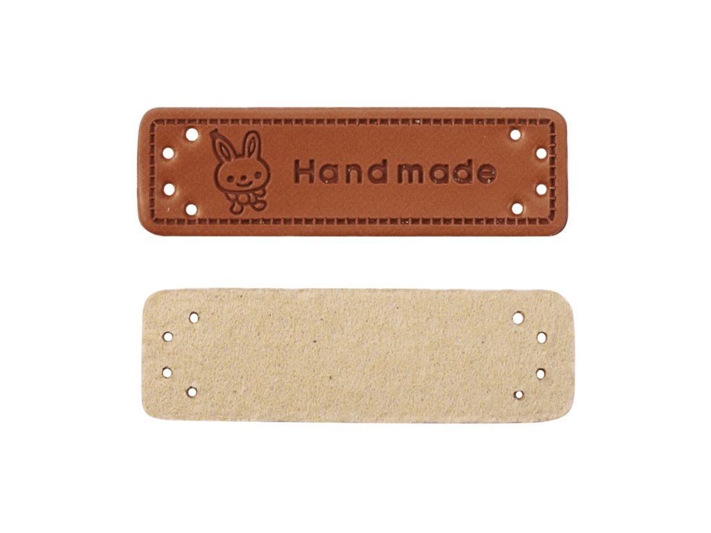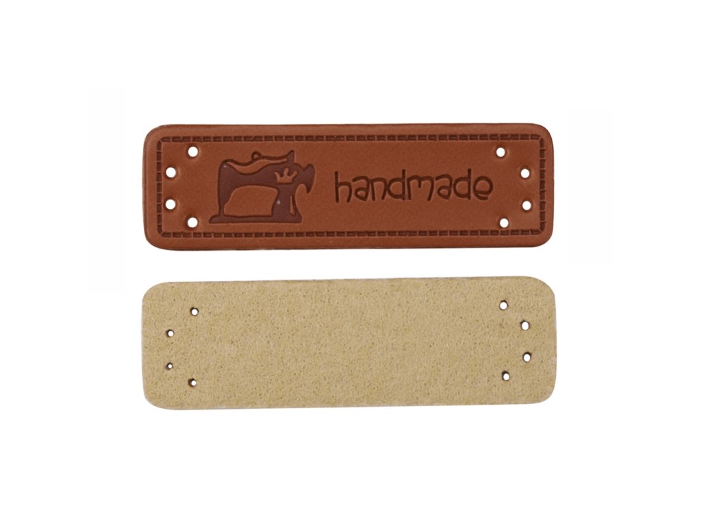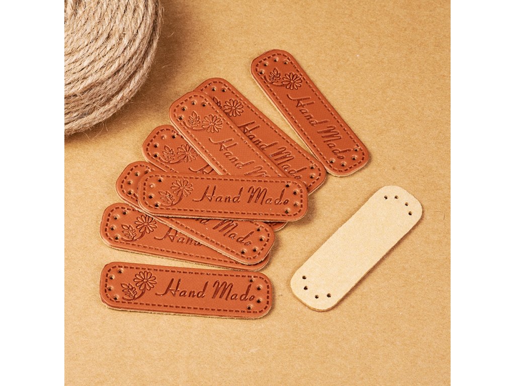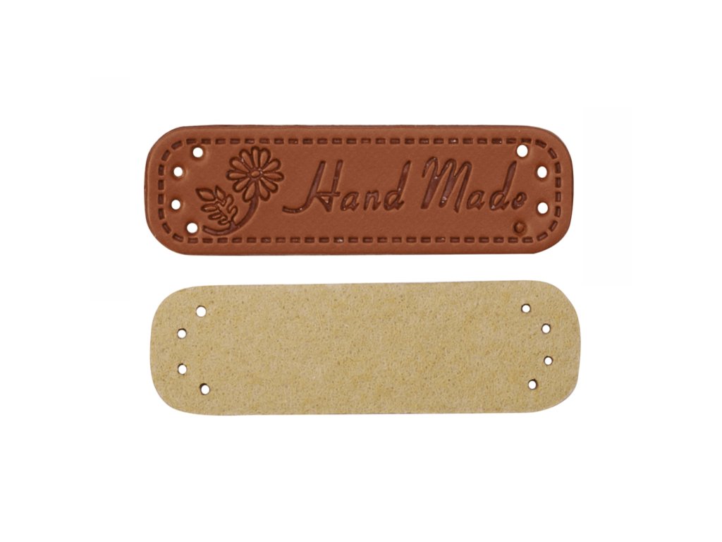 Cedulku oválného tvaru zdobí jednostranný nápis "hand made". Zaujme vás předseknutými otvory, které slouží jako dekorace. Po stranách cedulky jsou dírky, díky kterým ji lze přišít nebo jimi provléct šňůrku.