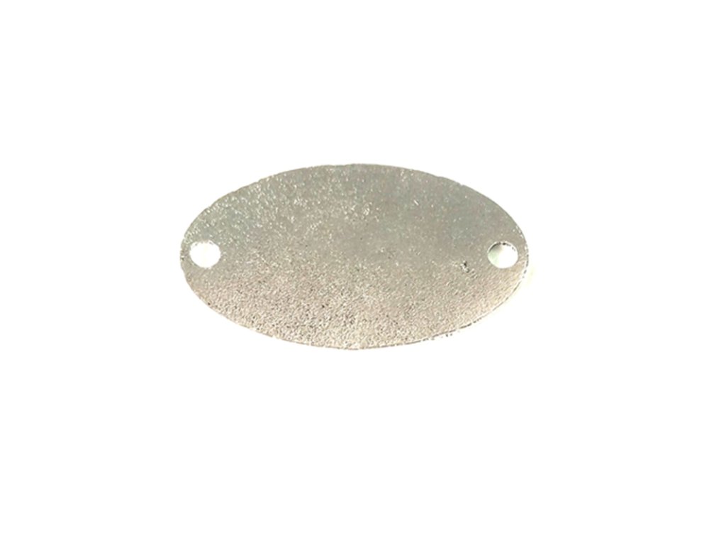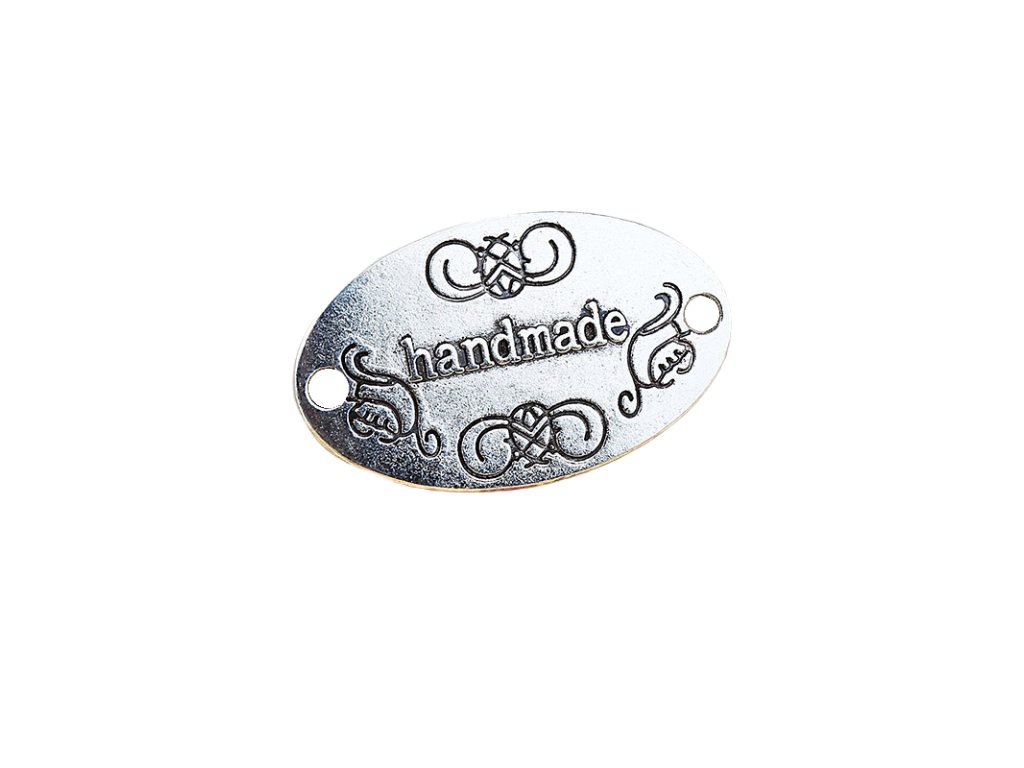 Cedulku oválného tvaru zdobí jednostranný nápis "hand made". Po stranách cedulky jsou dírky, díky kterým ji lze přišít nebo jimi provléct šňůrku.