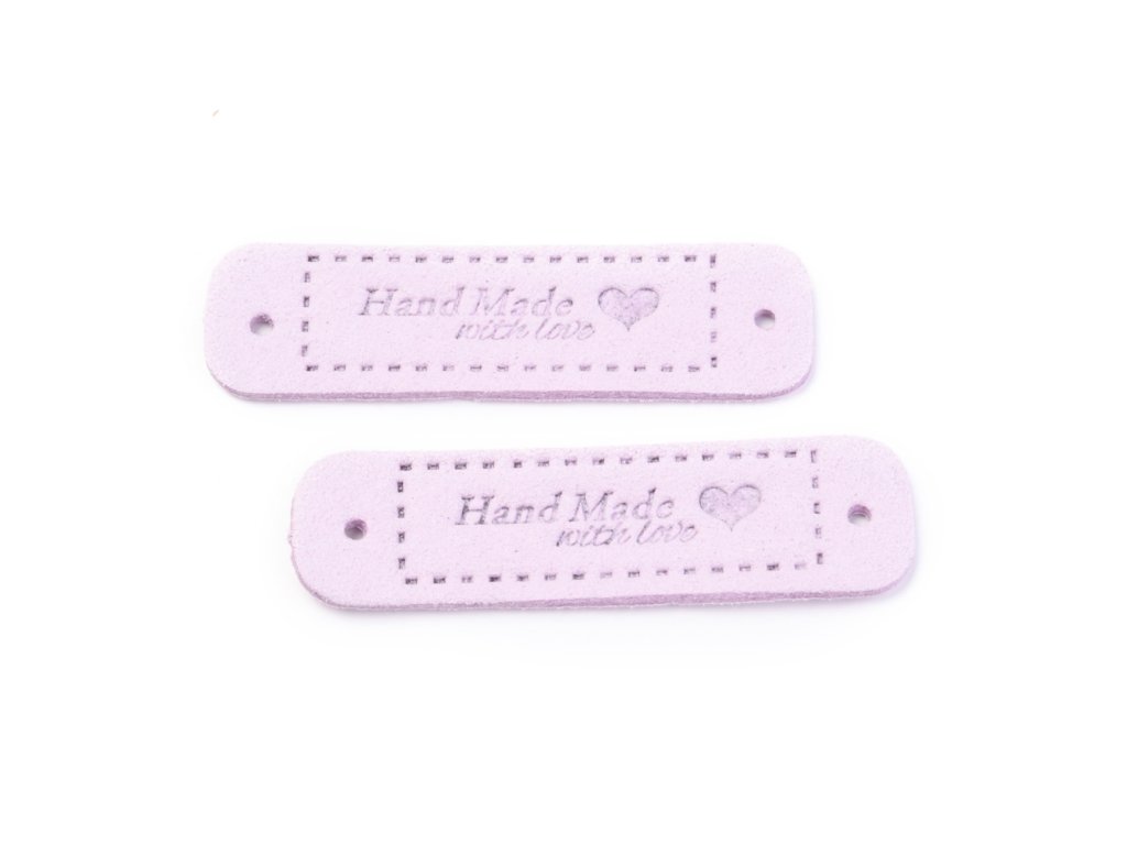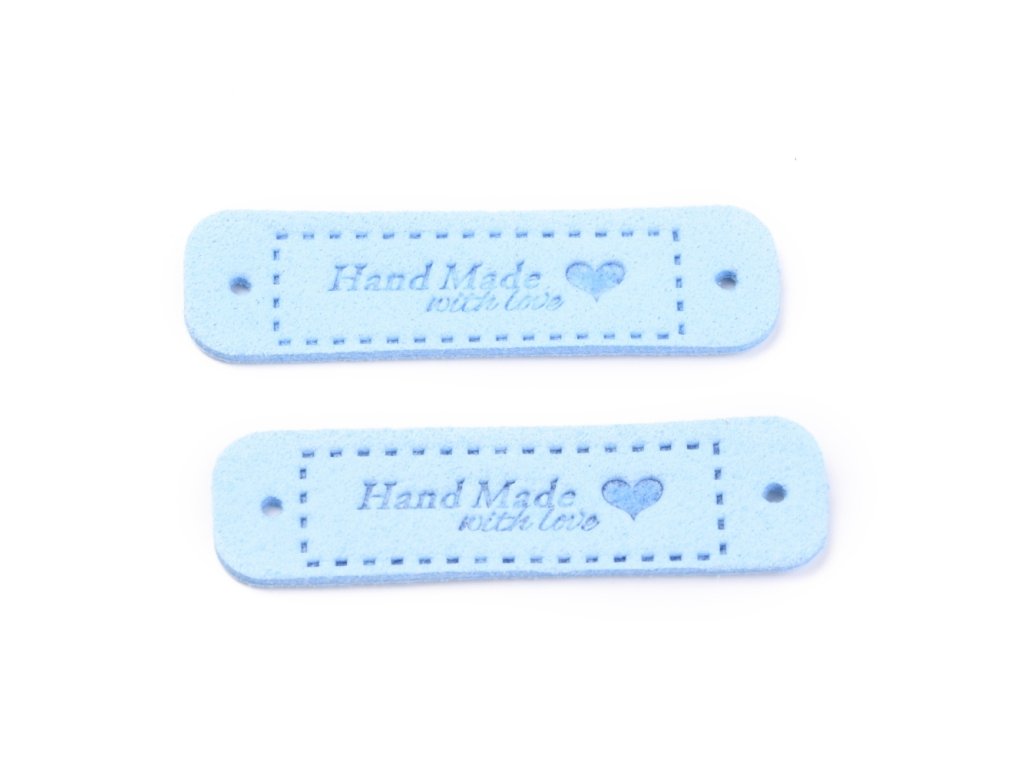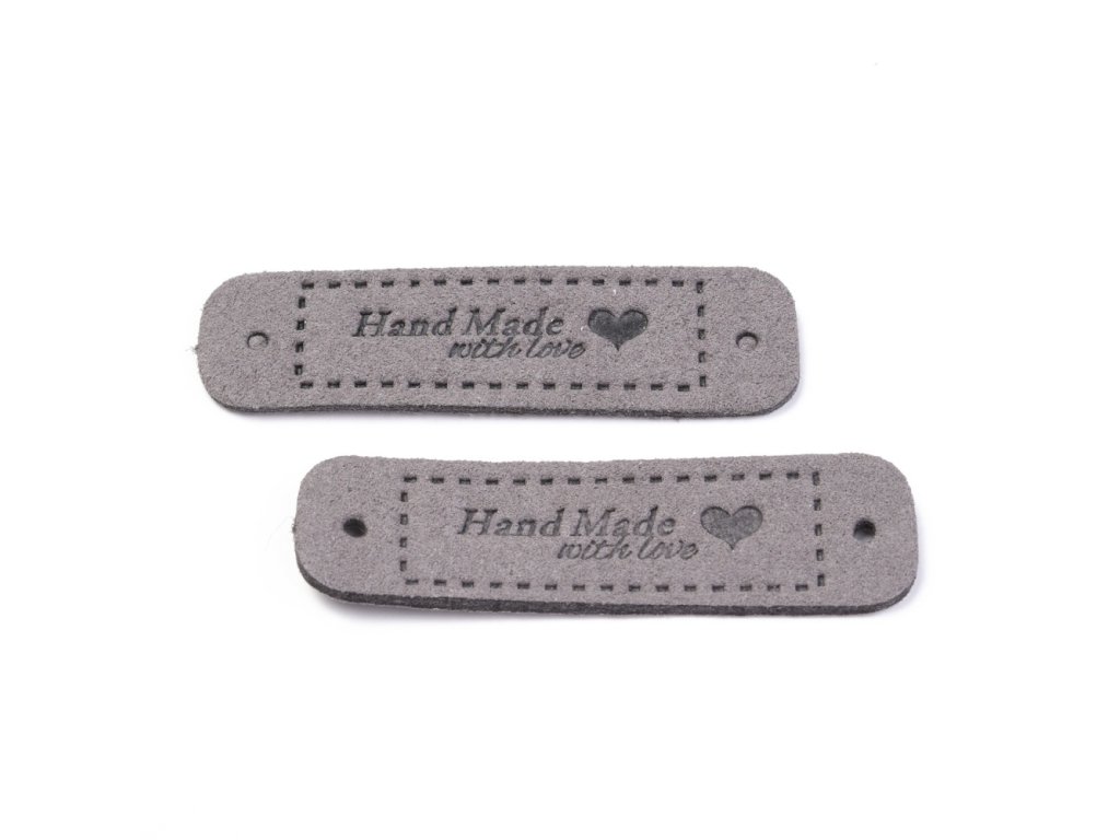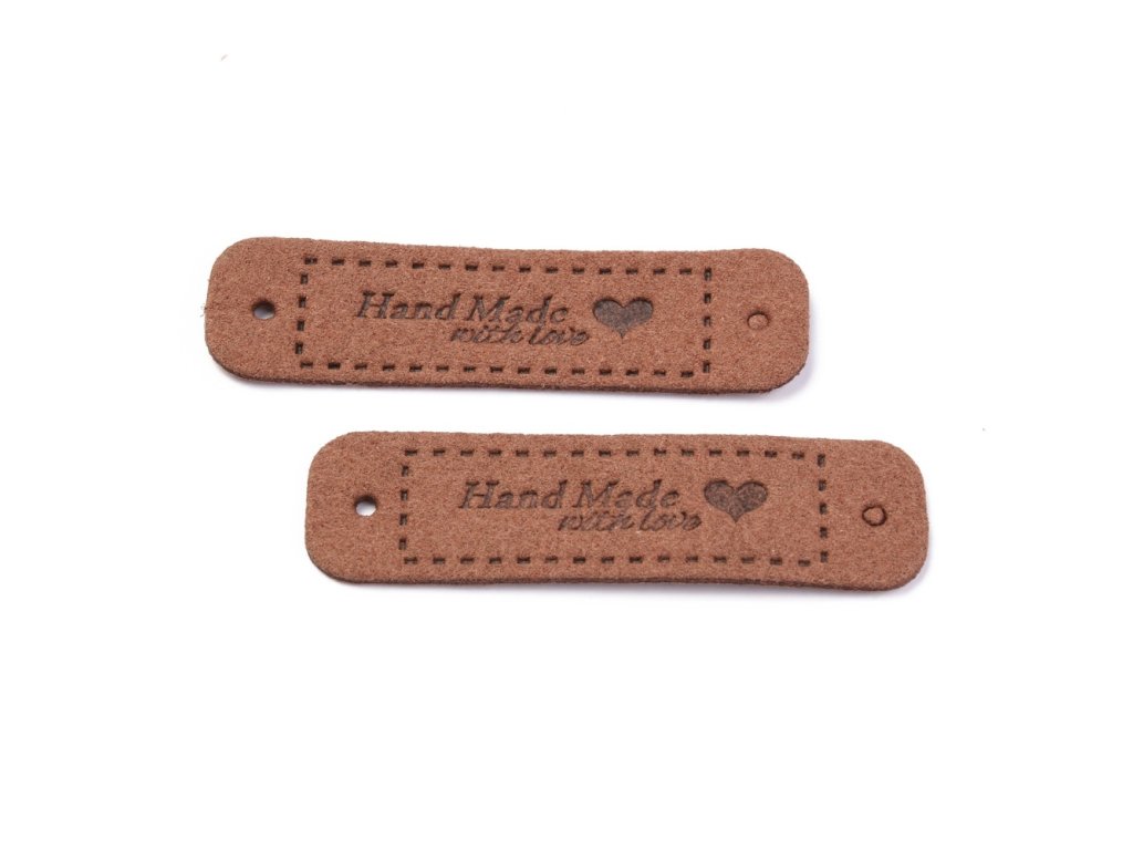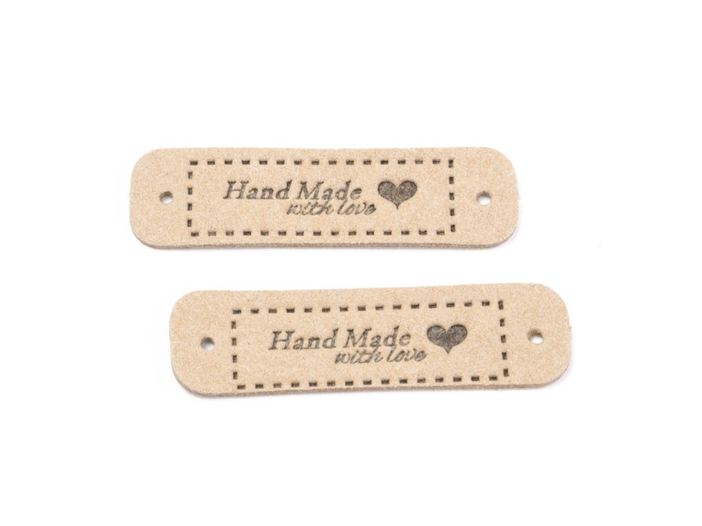 Cedulku z eko kůže oválného tvaru zdobí jednostranný nápis "hand made". Zaujme vás předseknutými otvory, které slouží jako dekorace. Po stranách cedulky jsou dírky, díky kterým ji lze přišít nebo jimi provléct šňůrku.