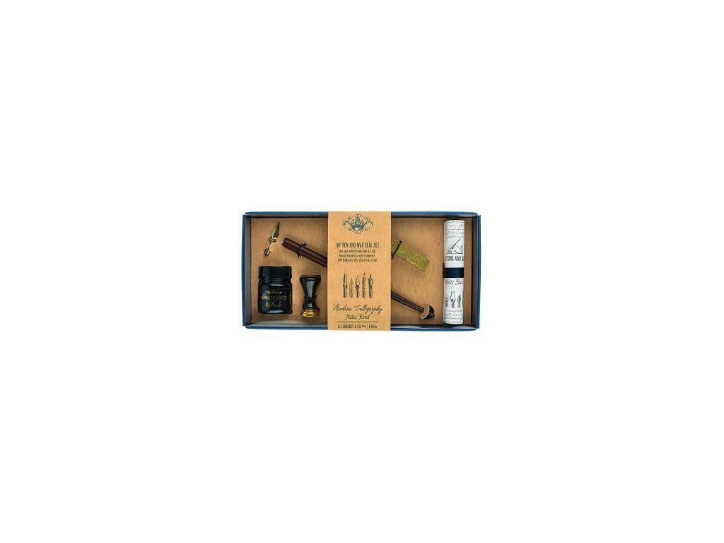 Sada obsahuje násadku a 3 perka, lahvičku s černým inkoustem o objemu 25 ml, pečetící vosk ve zlaté barvě, pečetítko s jedním razidlem a návod.