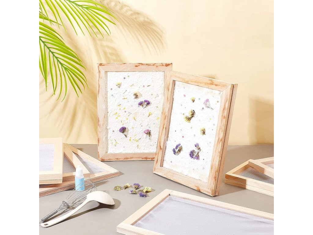 Sada tří dřevěných sít na ruční výrobu papíru. Různé velikosti umožňují tvořit papír různých formátů. Slouží k filtrování a tvarování papírové drti. Ideální pro domácí i kreativní použití.