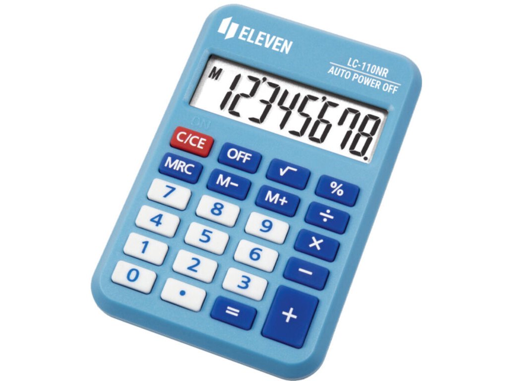 Kapesní kalkulačka - modrá: 8 místný displej, 3 paměťové klávesy: MRC, M+, M-, Odmocnina [?], Procenta [%], Bateriové napájení