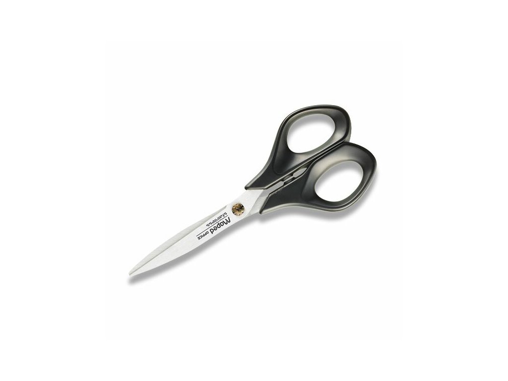 Nůžky vyrobené ze 70 % z recyklovaného materiálu, velikost 17 cm. Nože i nýt z nerezové oceli, symetrické ergonomické rukojeti.