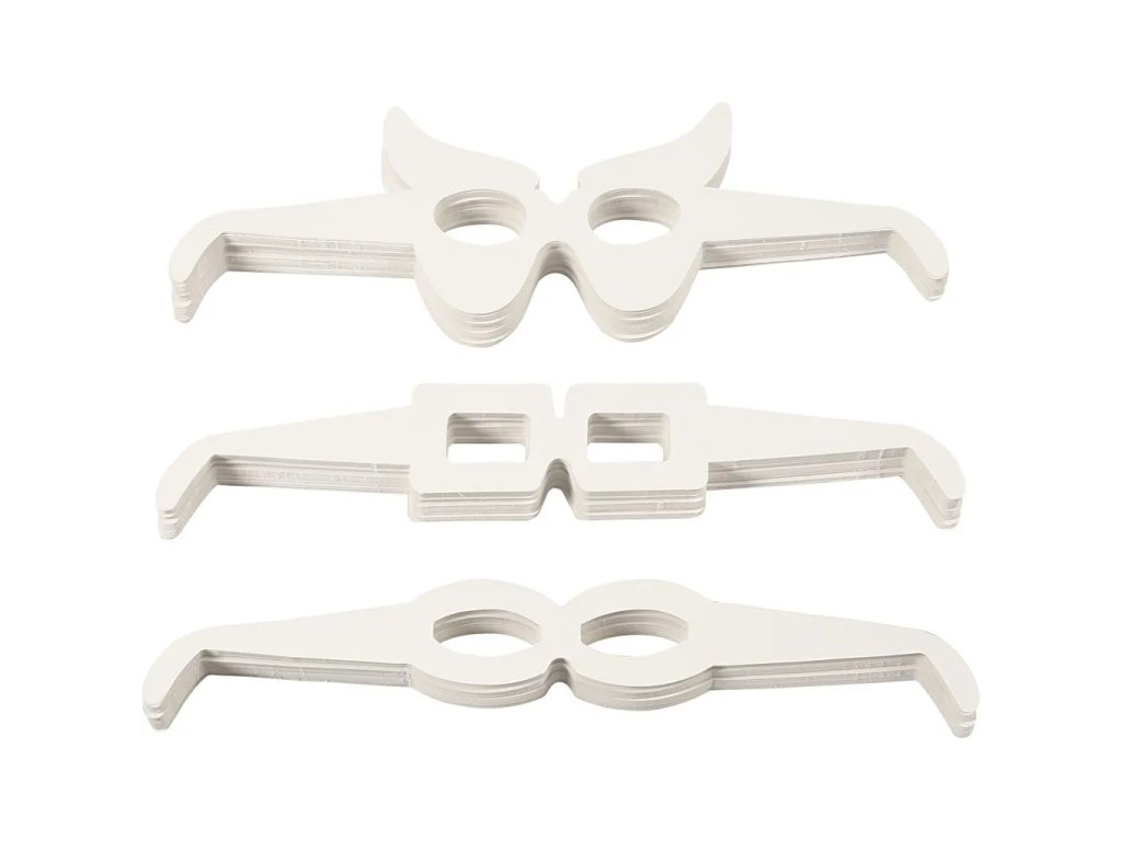 Zábavné papírové brýle pro tvoření, oslavy i karnevaly. V balení najdete tři různé tvary brýlí z bílého kartonu, které si můžete sami dozdobit podle vlastní fantazie.