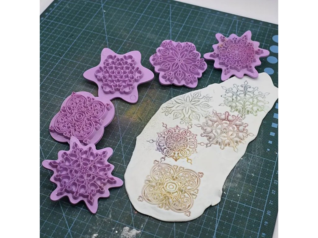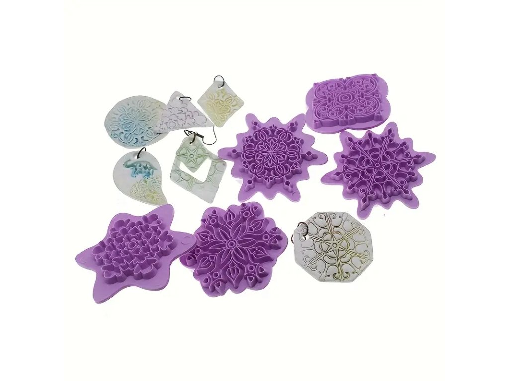 Sada obsahuje razítka s motivem mandaly a krajky, které jsou ideální pro výrobu náušnic, přívěsků z polymerové hlíny, texturování mýdla či dekorování keramiky.